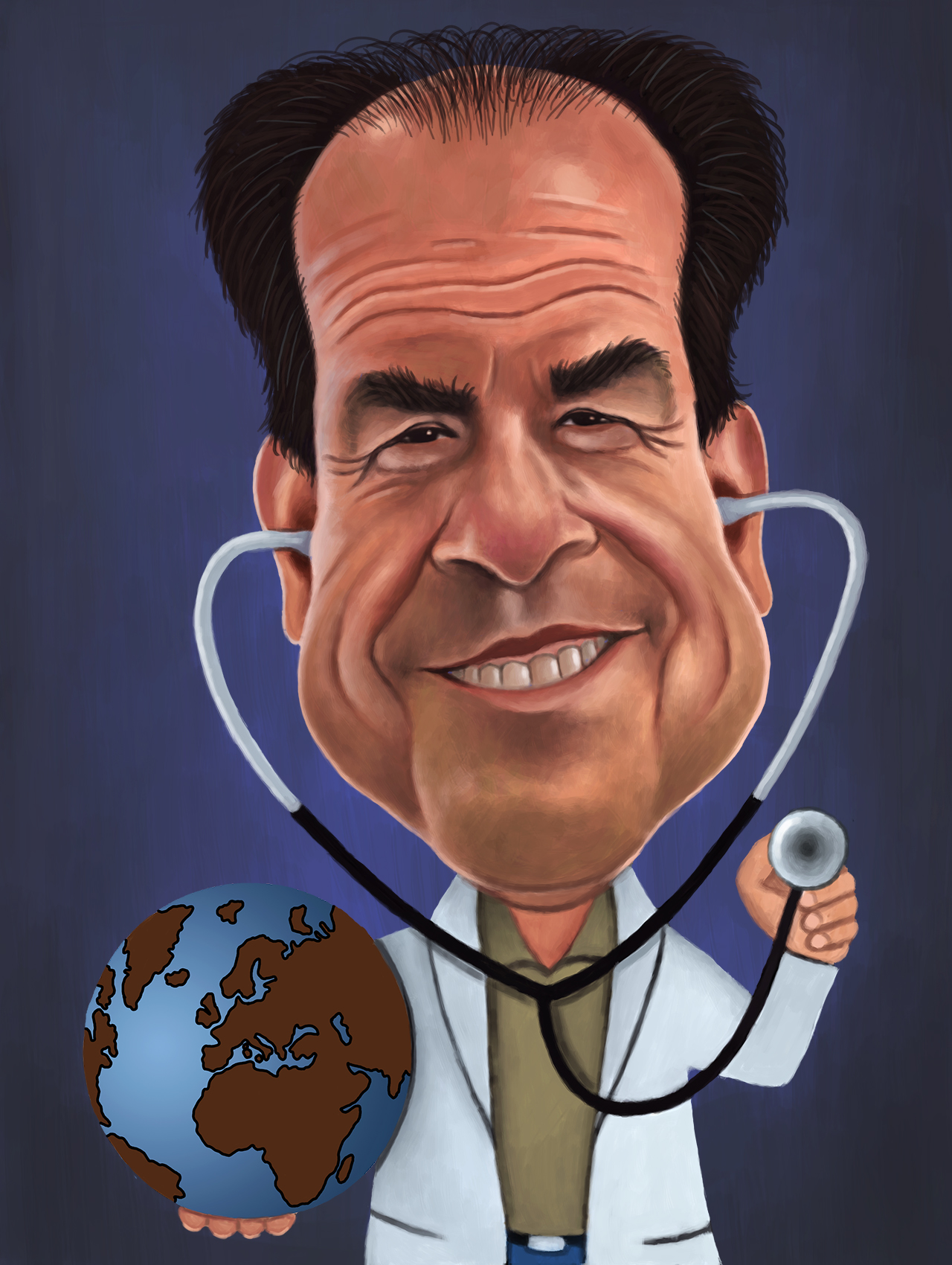 Esta es la caricatura del doctor Trinitario Ortuño (Trino para los amigos), médico en Orihuela y viajero por el mundo. Su caricatura ha sido encargada por su hija Julia, a quién también caricaturizamos con su hija Candela por encargo de Ginés, su marido y yerno de Trino, que consiguió su caricatura por encargo de María, tía de Candela y de Lola que recibieron las suyas como regalo por sus respectivas comuniones…